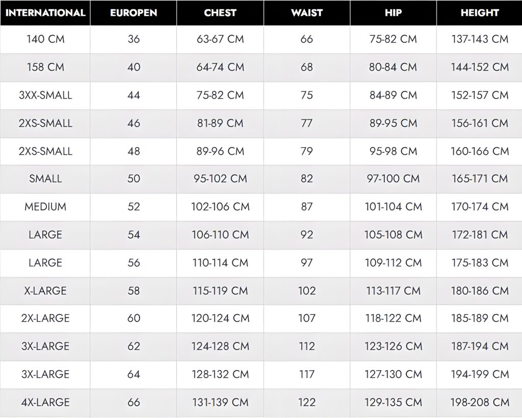 110 CM Kids, 120 CM Kids, 130 CM Kids, 140 CM, Euro 36, 140 CM Kids, 157 CM, Euro 40, 2X-Large, Euro 60, 2XX-Small, Euro 46, 2XX-Small, Euro 48, 3X-Large, Euro 62, 3X-Large, Euro 64, 3XX-Small, Euro 44, 4X-Large, Euro 66, Large, Euro 54, Large, Euro 56, Medium, Euro 52, Small, Euro 50, X-Large, Euro 58